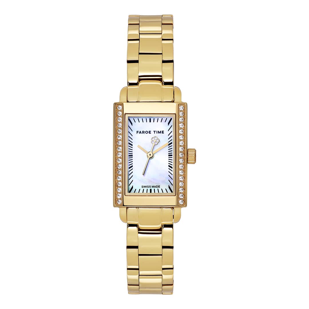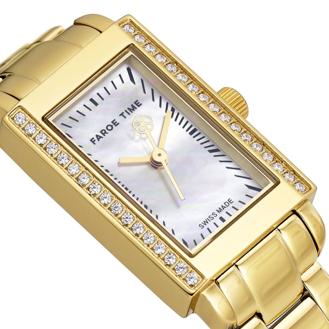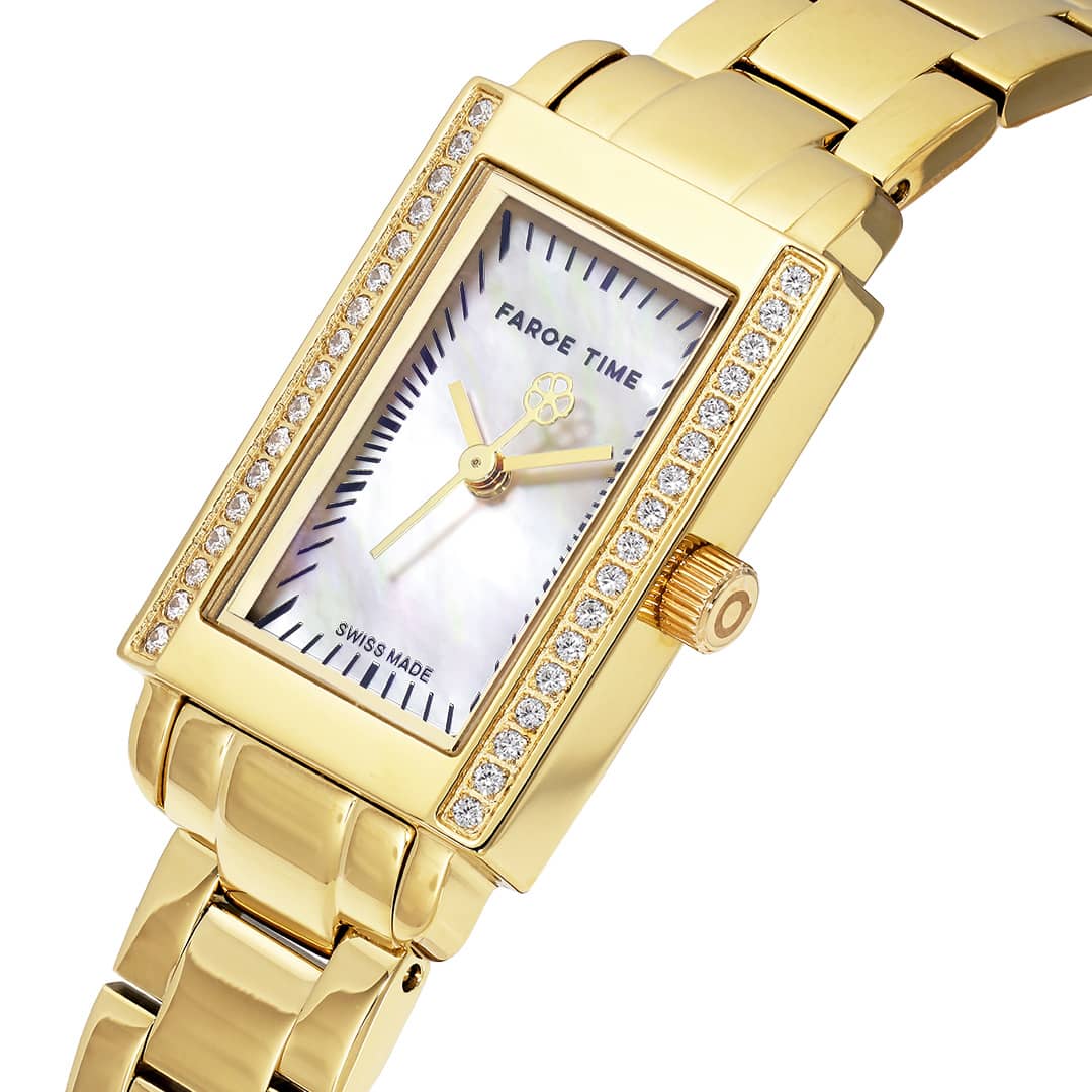 A rectangular watch 18×27 mm with zirconia. The national flower of the Faroe Islands, the Sólja (marsh marigold), is delicately placed on the second hand.